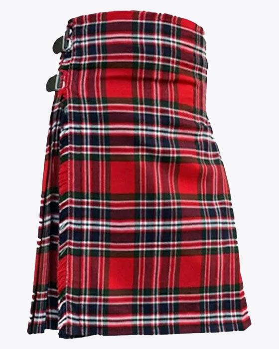 Each tartan kilt has 3 buckles and straps for size adjustment: genuine leather waist straps (4" long by 1 1/4" wide). Kilt straps on this kilt are set with an allowance of 2" looser. This kilt's front edge has fringe and is pleated to the sett but can be pleated to stripe by request. There are two belt loops at the back. The kilt has a 100% cotton lining for a soft feel when being worn. The standard kilt comes with a 5-yard, but you can convert it into an 8-yard by selecting the "8-yard kilt" option.